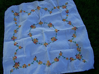 The table clothes pictured above and below are from a garage sale up at the lake. I love the autumn colours on this one and can just picture it on our harvest table with a bowl of acorns and some fall leaves.